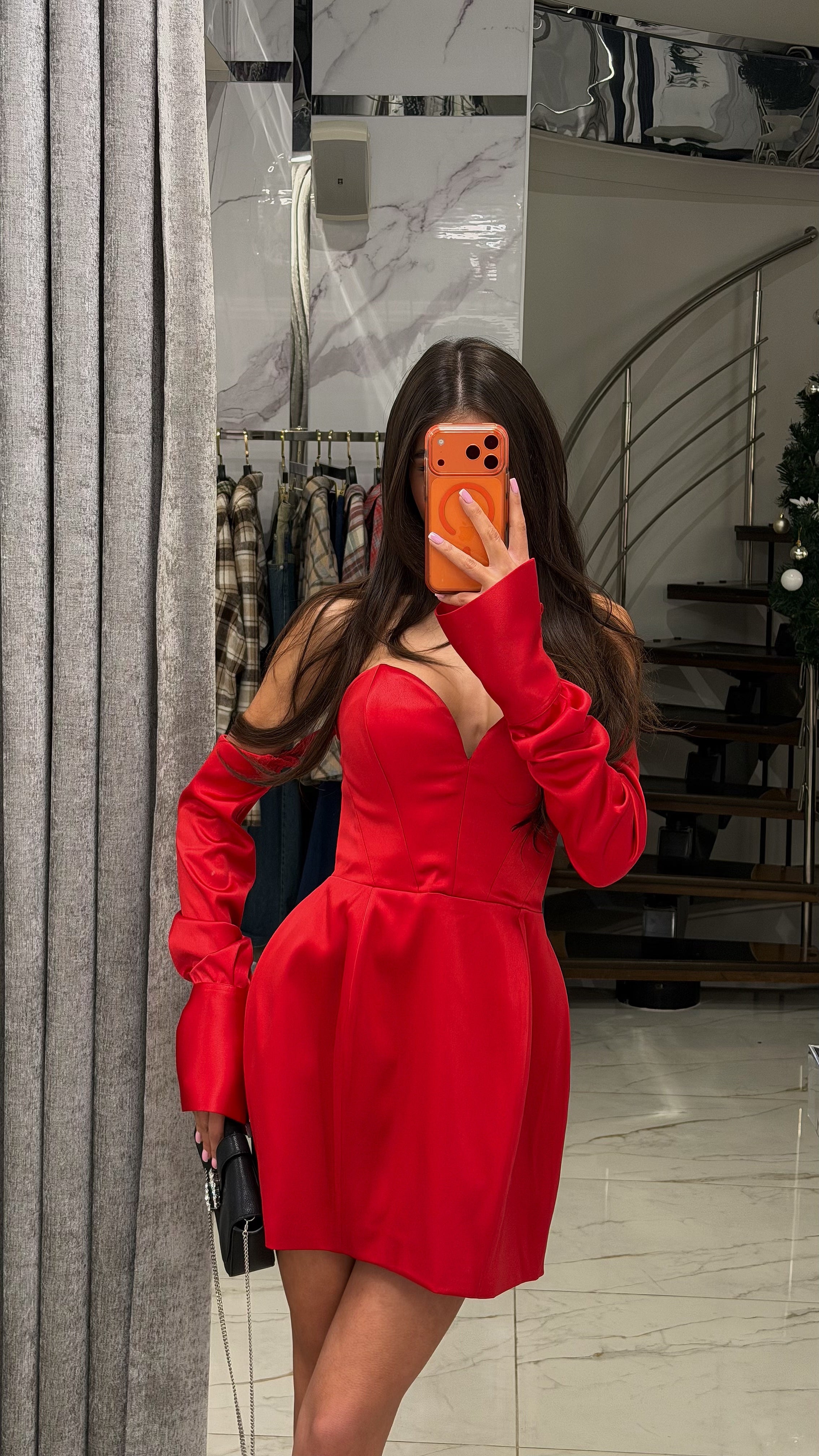 Елегантна коротка сукня з матласу . Модель має корсетний ліф, який красиво формує силует, та відкриту лінію плечей, що додає образу витонченості. Довгі рукави створюють баланс між класикою та сучасним стилем.Завдяки щільній, але комфортній тканині сукня добре тримає форму та приємна до тіла.