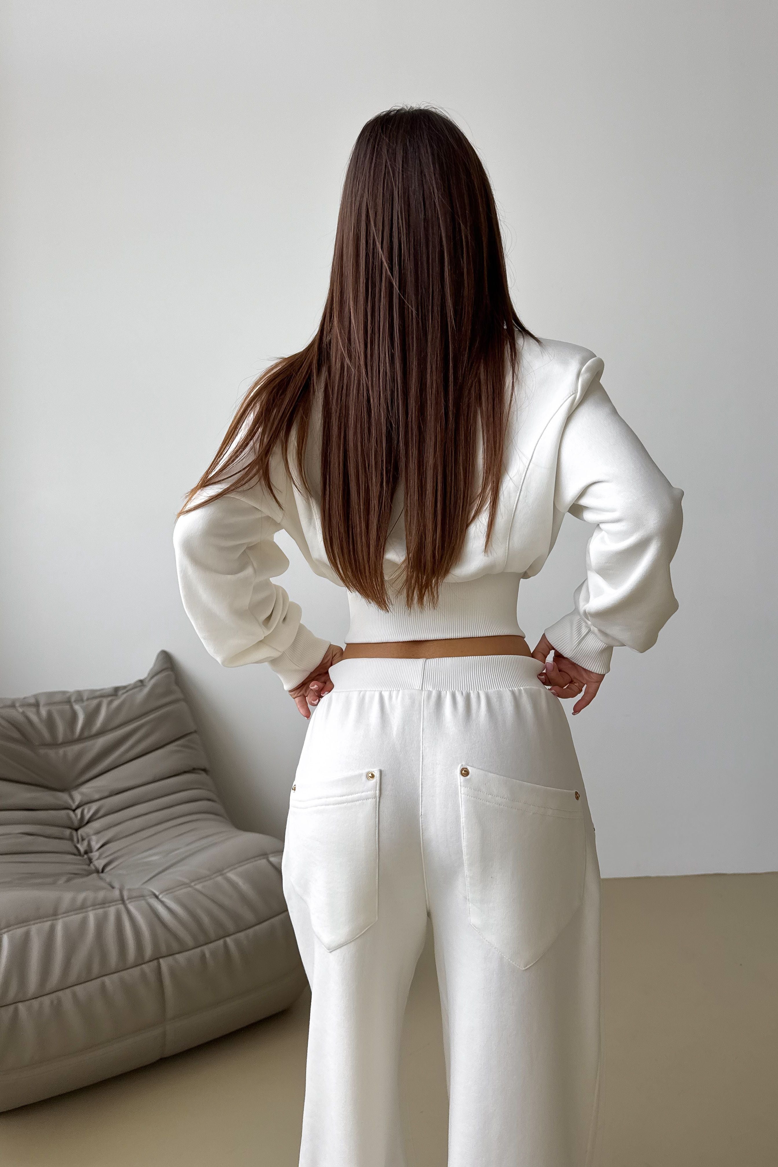 A delicate, feminine and incredibly comfortable suit designed for those who appreciate style in every detail. The cut harmoniously emphasizes the figure.A cropped jacket with a zipper and a wide elastic band at the waist creates a sophisticated silhouette, while straight trousers with arrows add elegance and relaxed chic to the look. Ideal for both city walks and stylish trips.Comfort and aesthetics that you want to wear every day.