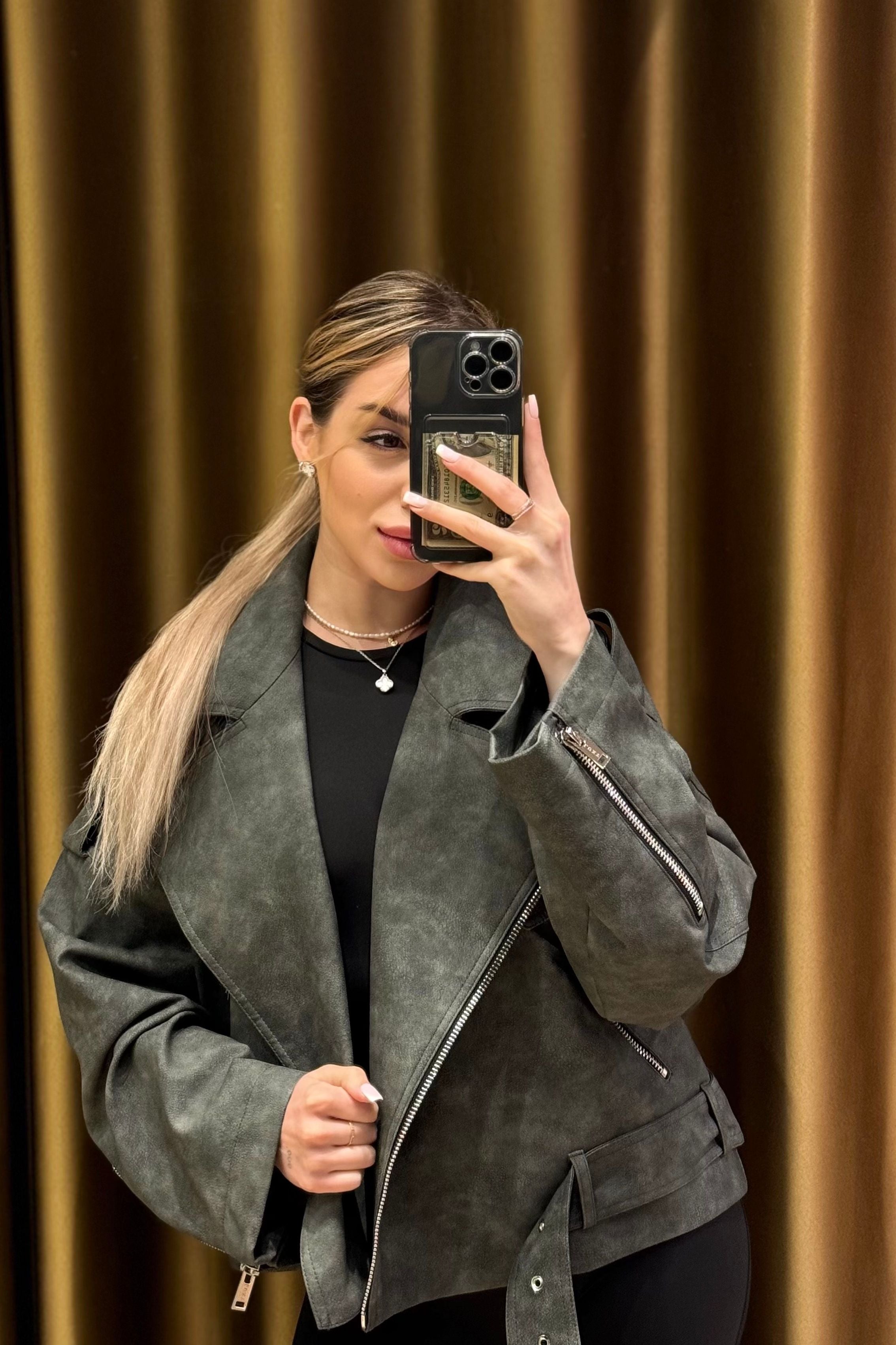 A biker-style eco leather jacket with a vintage suede effect. Metal hardware and front zipper create a bold look. Lightweight yet structured, it’s ideal for transitional seasons.