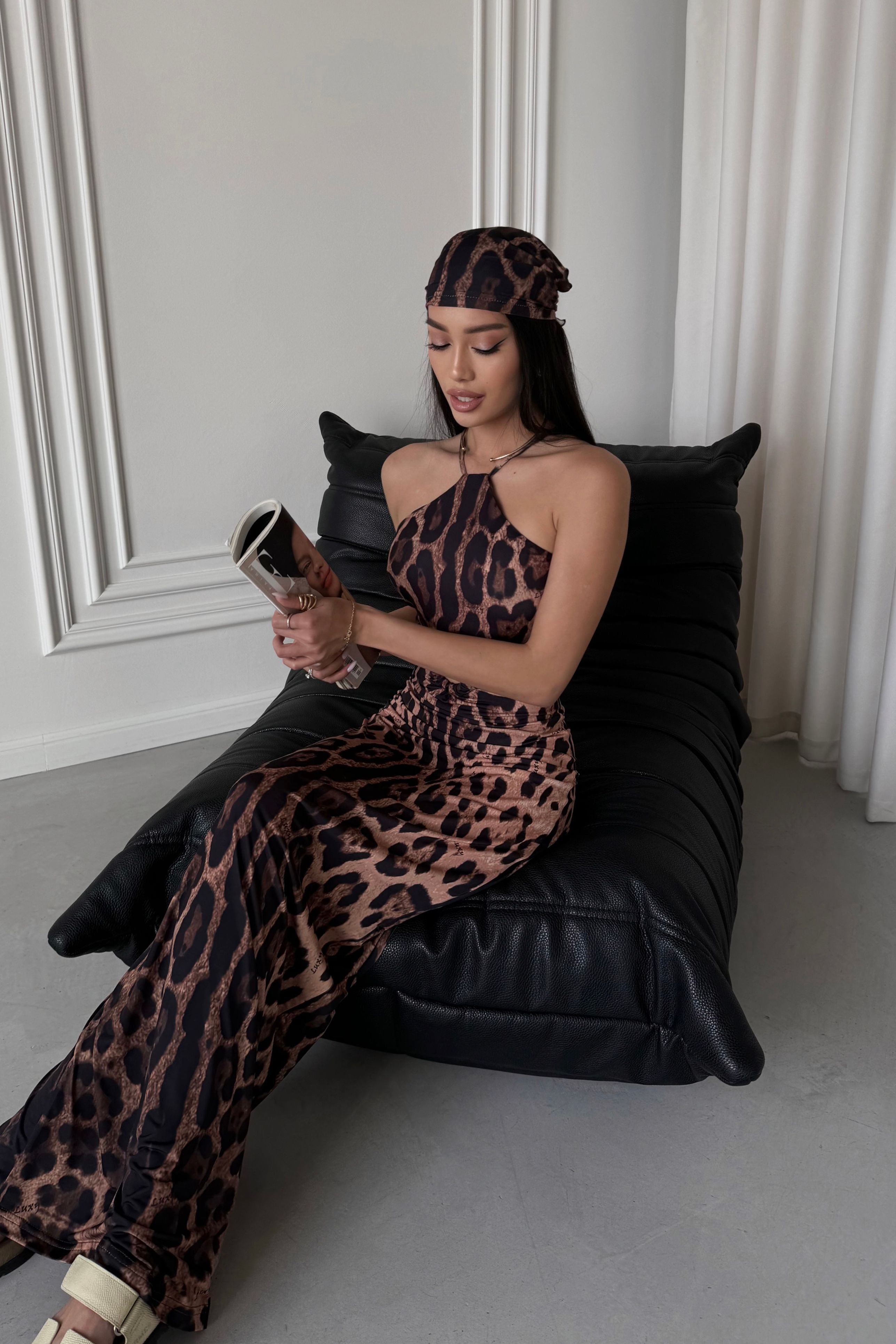 Ця ефектна сукня в комплекті з банданою — справжній must-have для яскравого літнього сезону. Виконана з еластичної тканини з трендовим леопардовим принтом, вона створена для тих, хто не боїться бути в центрі уваги.Модель має відкриту спинку та зав’язується на шиї та на спині, що дозволяє регулювати посадку та підкреслює витонченість фігури. Декоративне кільце на талії додає акценту, а облягаючий крій вигідно виділяє силует.