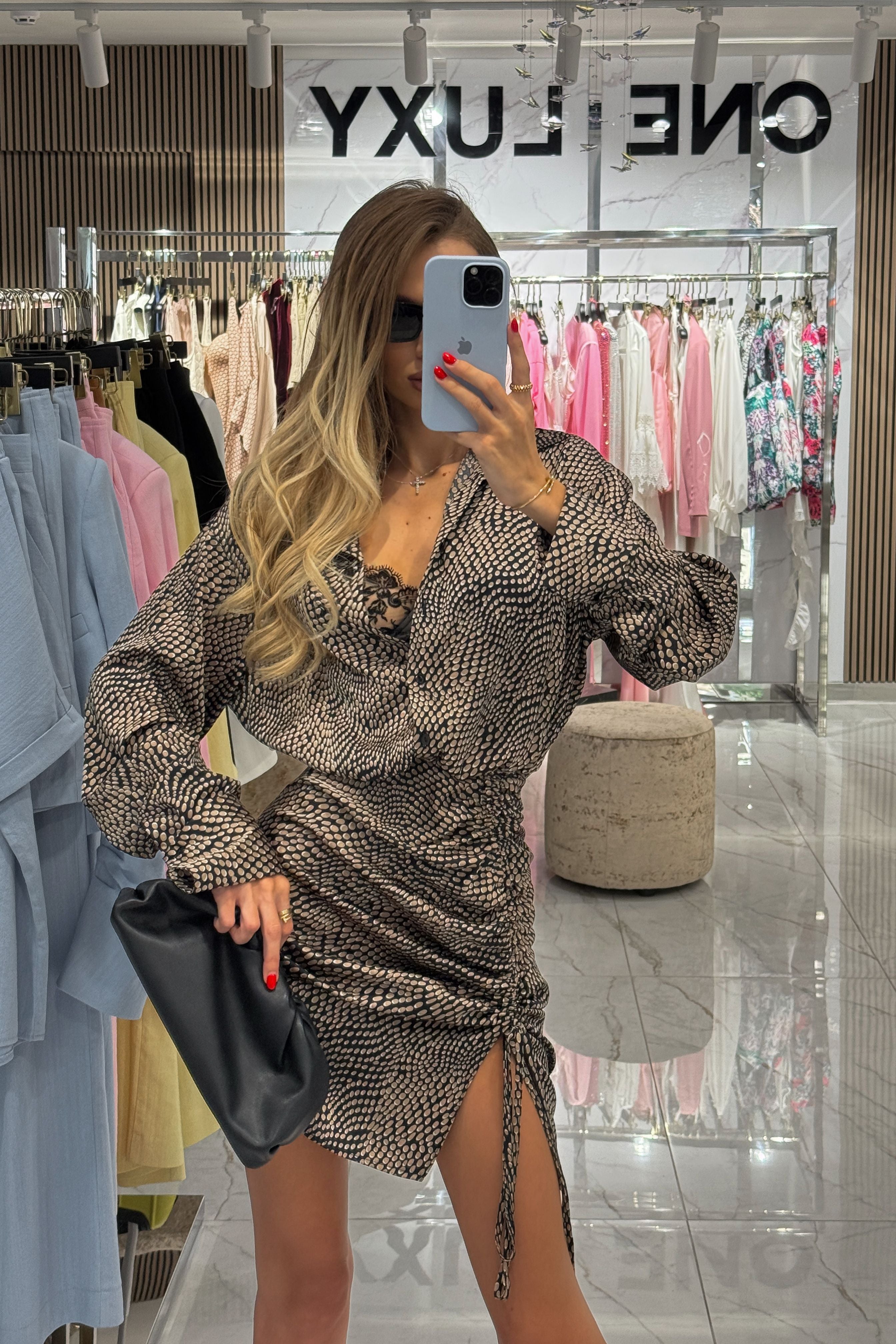 Стильна сукня, що поєднує елегантність та сучасну жіночність. Модель виконана з шовку та абстрактним принтом.Приталений силует з акцентом на талії та драпуванням з регульованою шнурівкою на стегні підкреслює фігуру та додає образу динаміки.Глибоке розпахнуте декольте, класичний комір та довгі рукави створюють збалансований, але сміливий лук, ідеальний як для вечірніх виходів, так і для стильних подій.