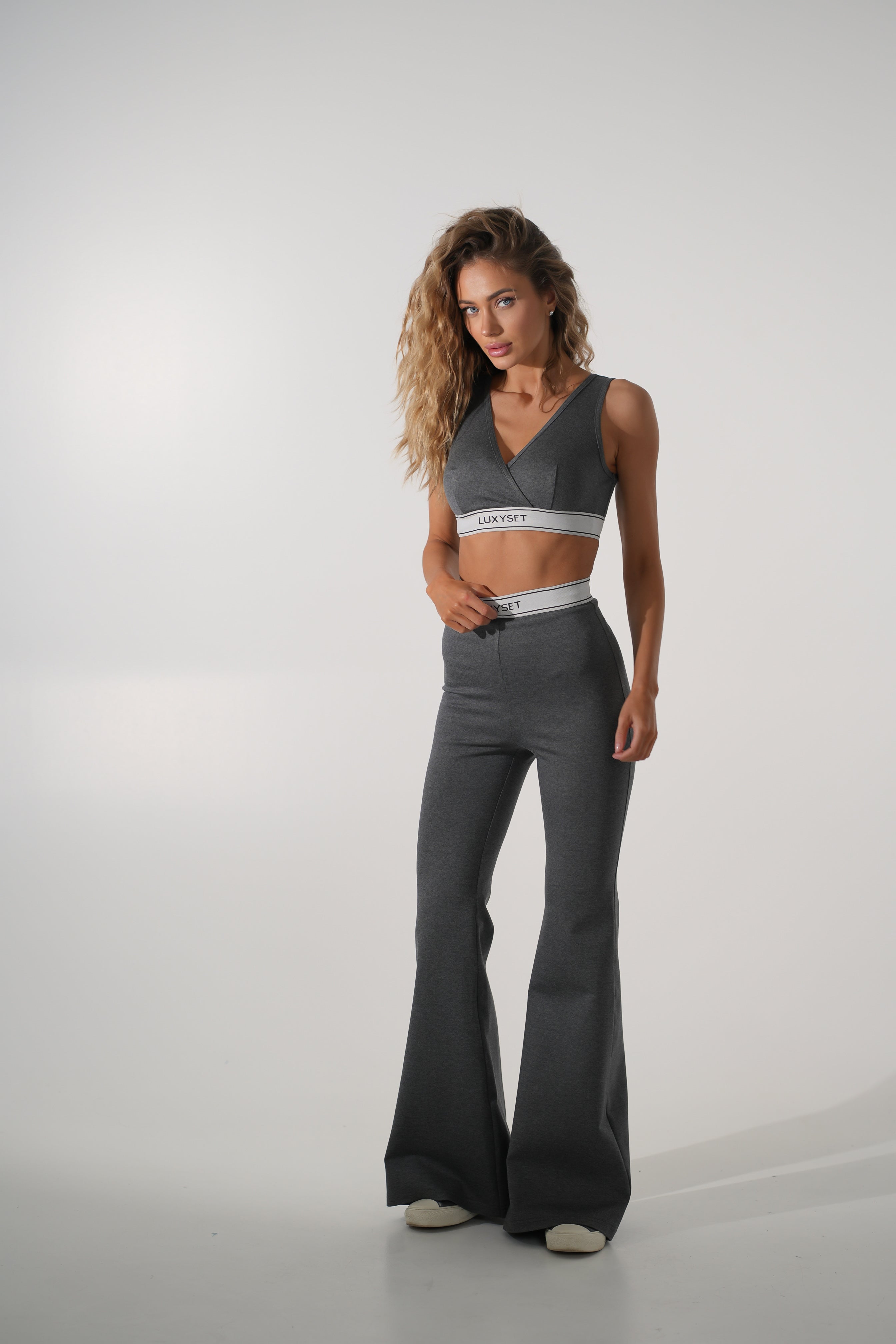 Цей стильний костюм створений для тих, хто цінує комфорт, якість та виразний силует. Щільна бандажна тканина ідеально облягає фігуру, моделюючи її та підкреслюючи кожен вигин. Комплект складається з короткого топа з відкритими плечима та високих розкльошених легінсів - вишуканий дует, що створює баланс між сексуальністю та елегантністю