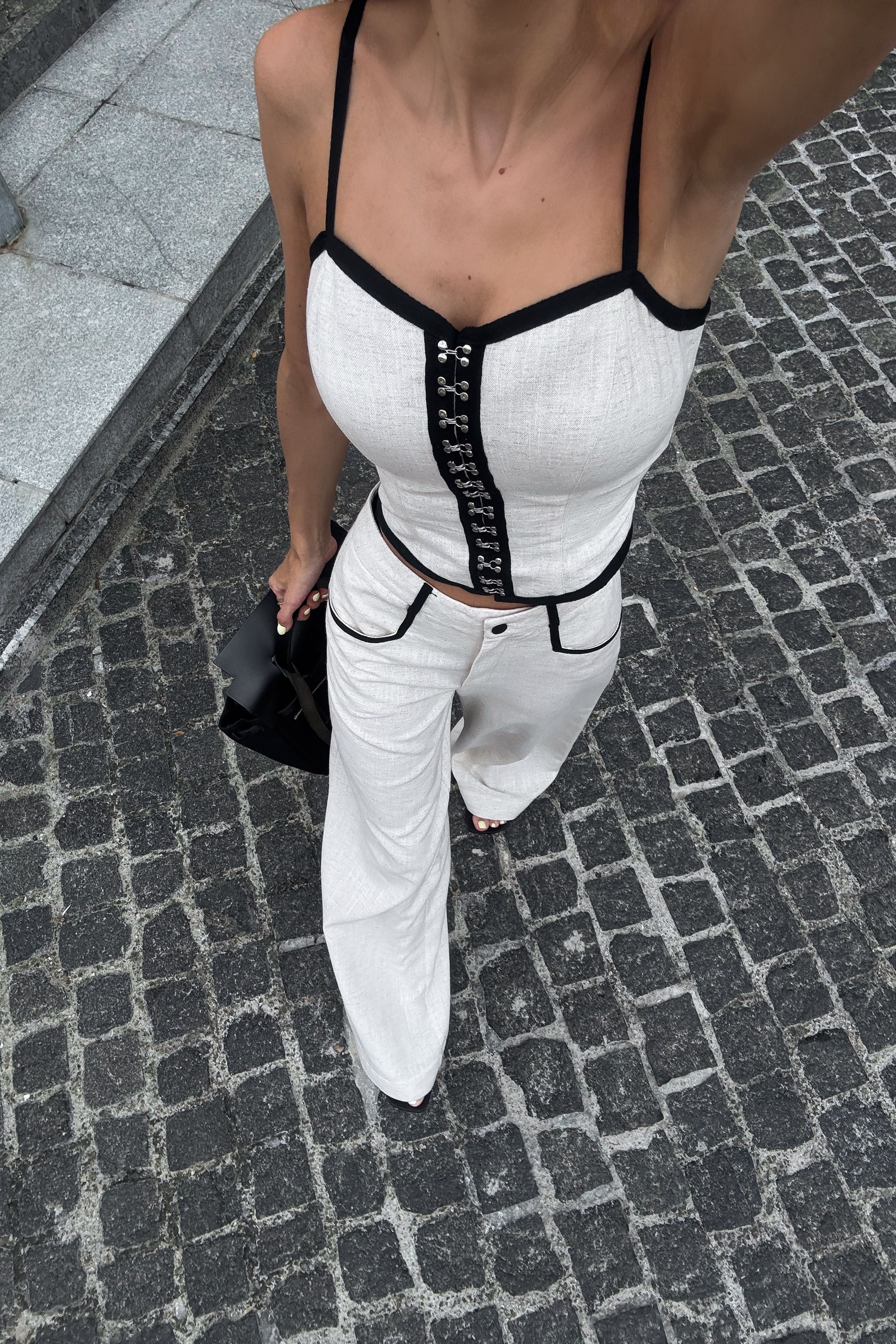 Цей лляний топ — ідеальне поєднання натуральності, комфорту та витонченого дизайну. Виготовлений із дихаючої лляної тканини у світло-бежевому відтінку, він стане базовим елементом літнього гардеробу.Застібання на гачках додає топу вишуканості та легкого настрою, а контрастна чорна обробка по краях і на бретелях підкреслює лінії крою та додає графічності образу.